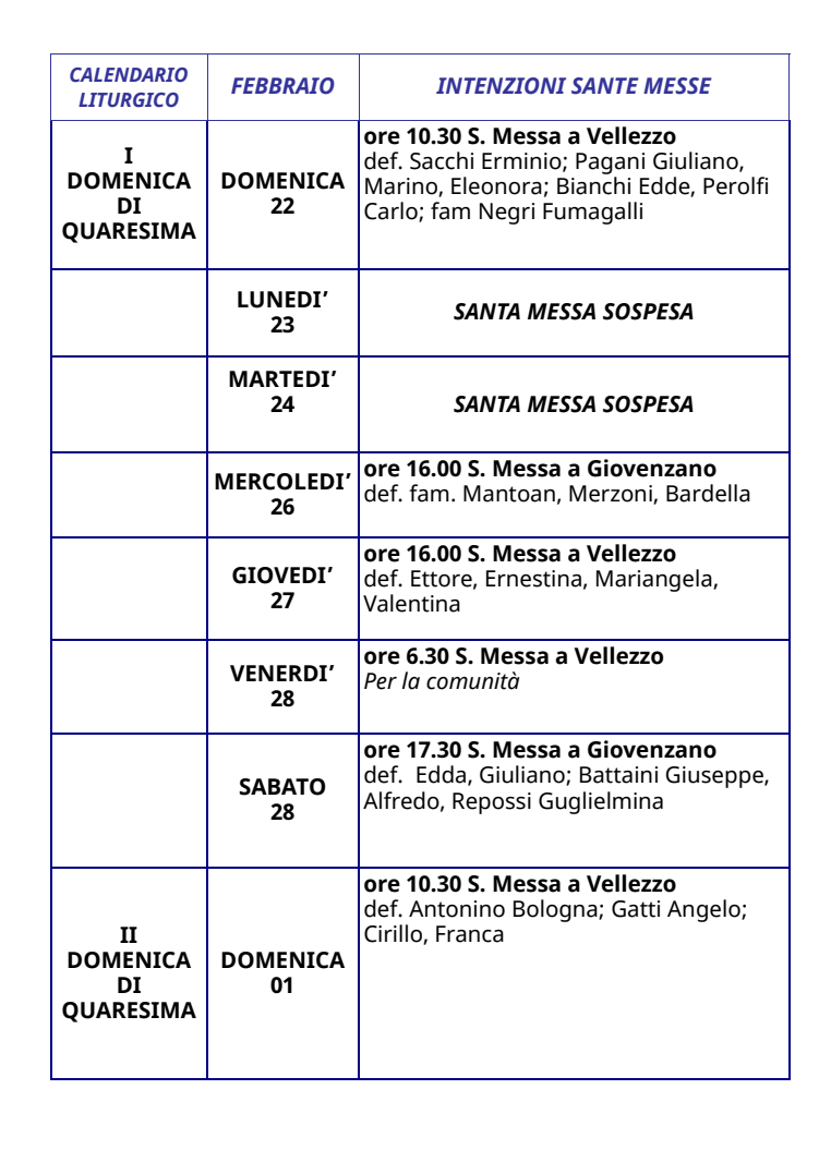 Calendario Liturgico dal 22 febbraio al 01 marzo 2026