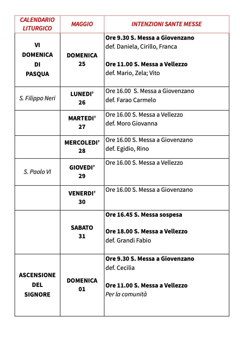Calendario Liturgico dal 25 maggio al 01 giugno 2025